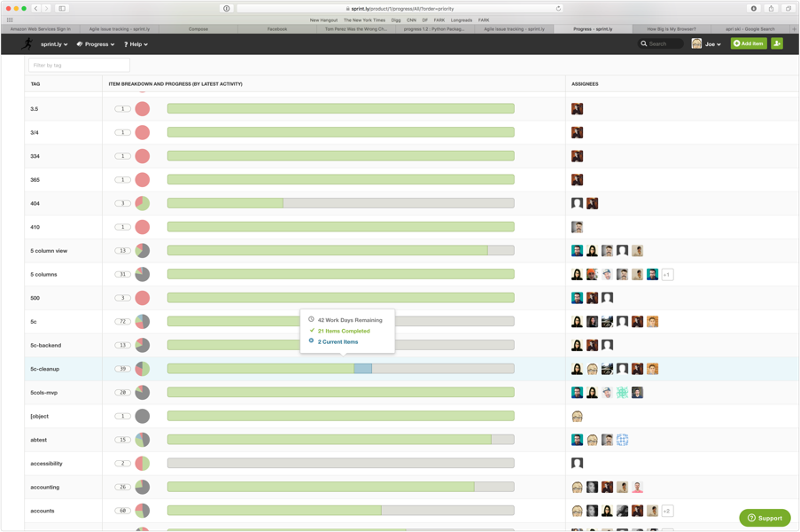 How long until your big feature ships? Our Progress view distills every tag in your project to a simple progress bar with estimated completion times.