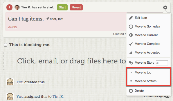 Over the weekend we deployed a small update to the gear menu on our item cards. There are two new options: “Move to top” and “Move to bottom”. Each, with a single click, will push the item to the top (or bottom) of its current column if it’s in Someday or Backlog.